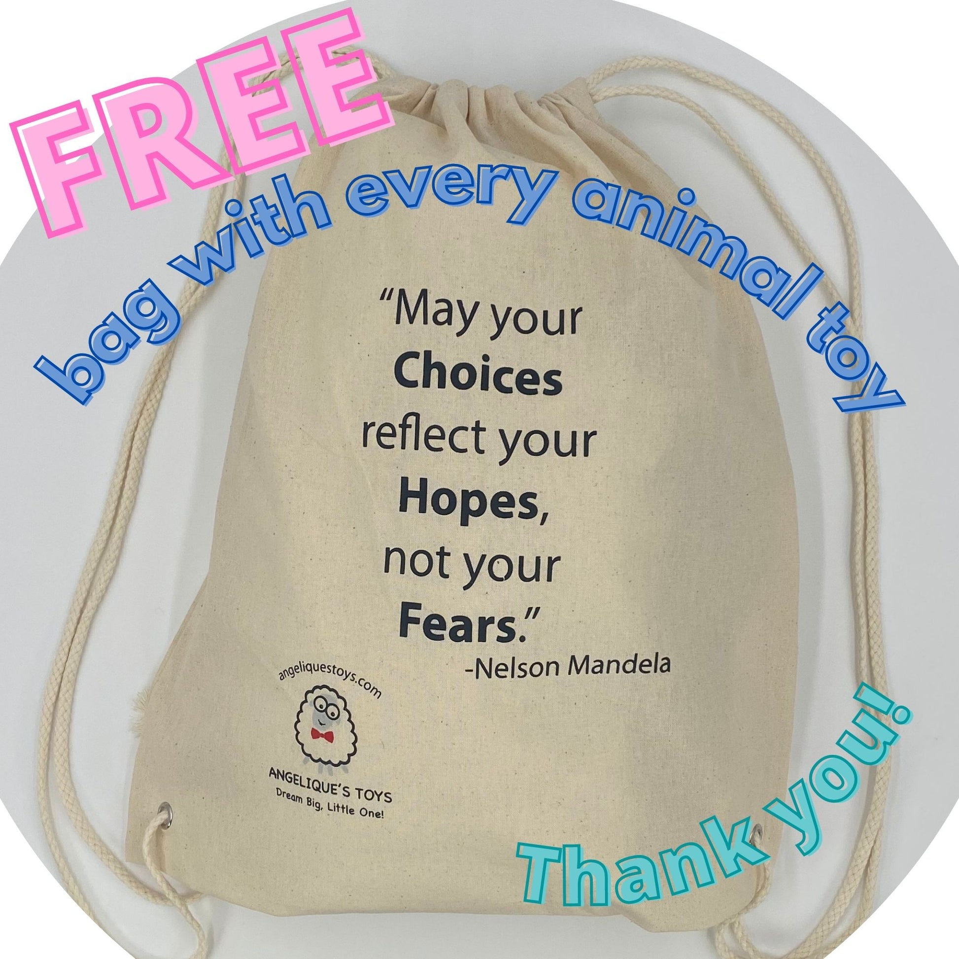FREE Recyclable 100% Cotton muslin drawstring bag with each stuffed animal toy.